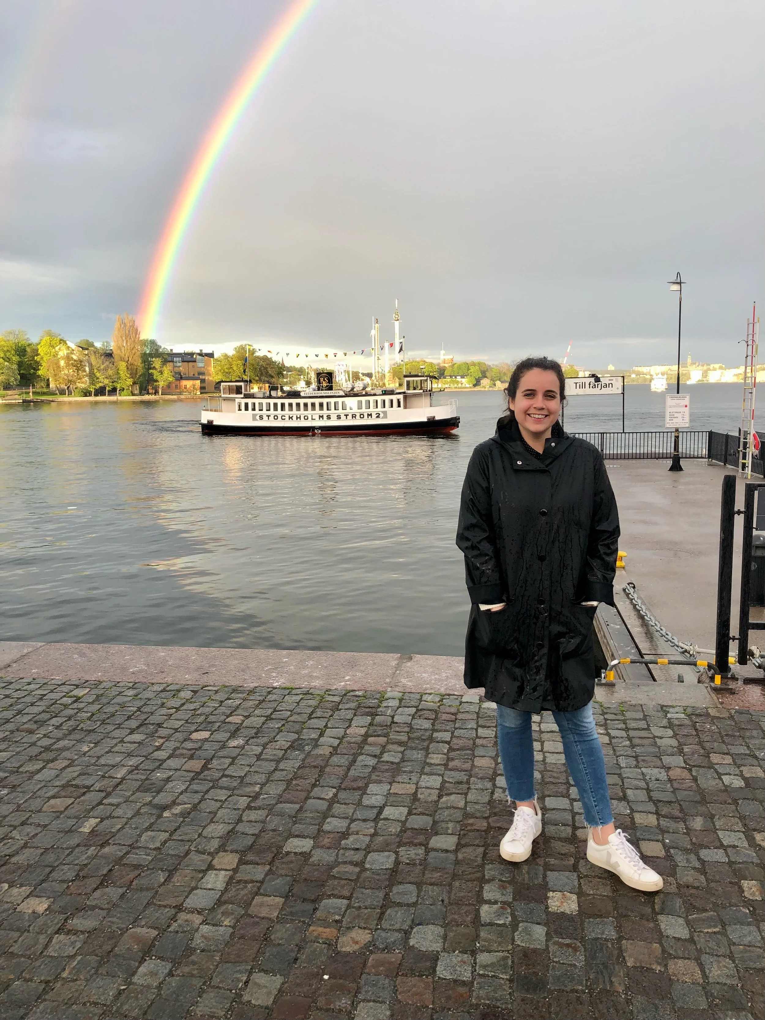 Jessica in front of a perfect rainbow in Stockholm. Jon Hull